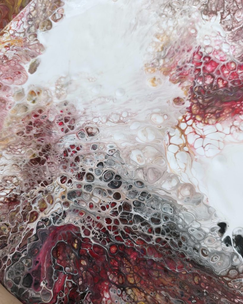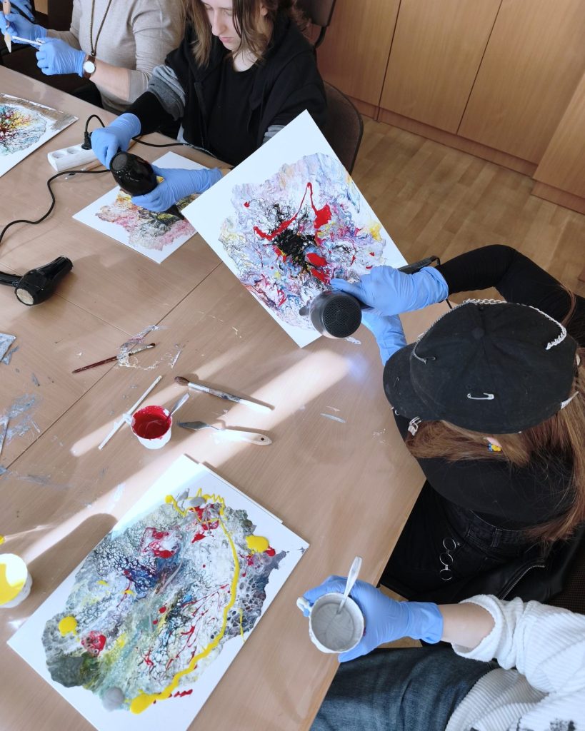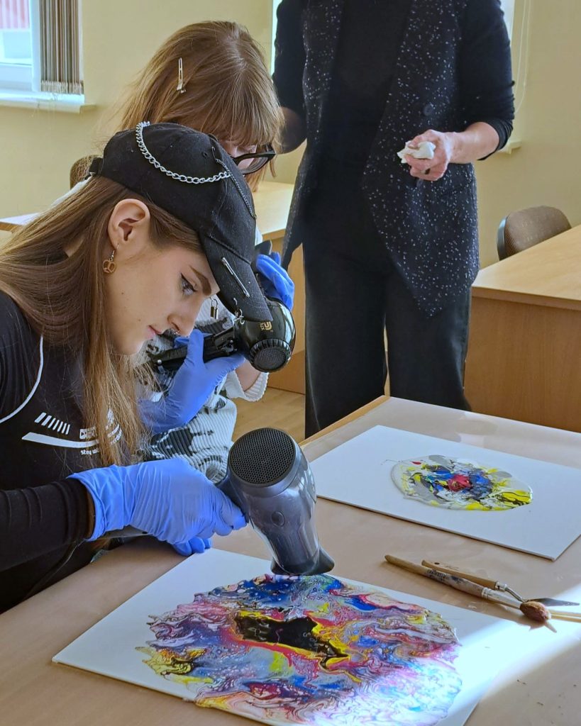 The guests were warmly welcomed by the Head of the Fashion Design Department, Gražina Skripkienė, along with lecturers and students. Participants had the opportunity to learn about the fluid painting technique (fluid art), which is increasingly used in contemporary creative practice, and to experiment with the so-called “flowing cell” effect practically. The lecturers presented both the theoretical and practical components of the creative workshop “Flowing Cell Art Masterclass”.